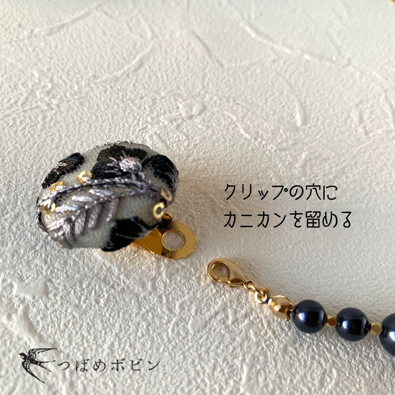 クリップの穴に、各パーツの両端のカニカン(開閉式のフック状金具)を留めることで、羽織紐やショールクリップ、袂留めクリップとしてお使いいただけます。