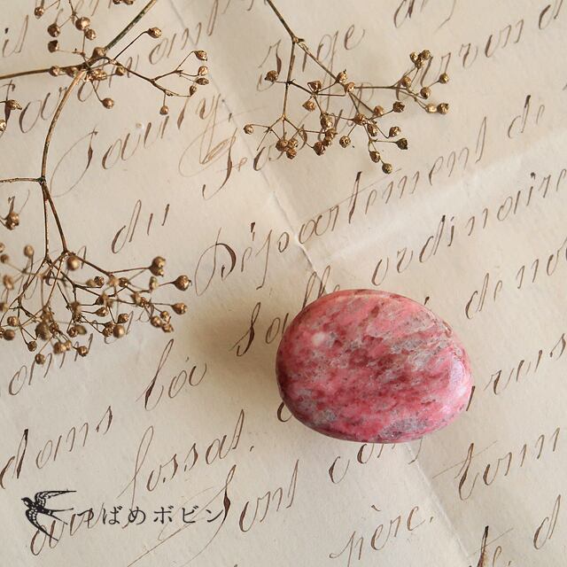 コロンとした小石のような形に、きれいなピンクを基調とした模様の入ったチューライト。