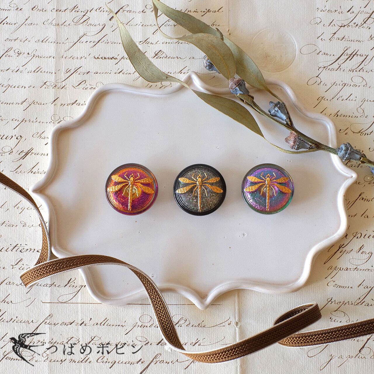 こちらは、ゴールドの彩色が施されたトンボのモチーフが描かれたガラスボタン。