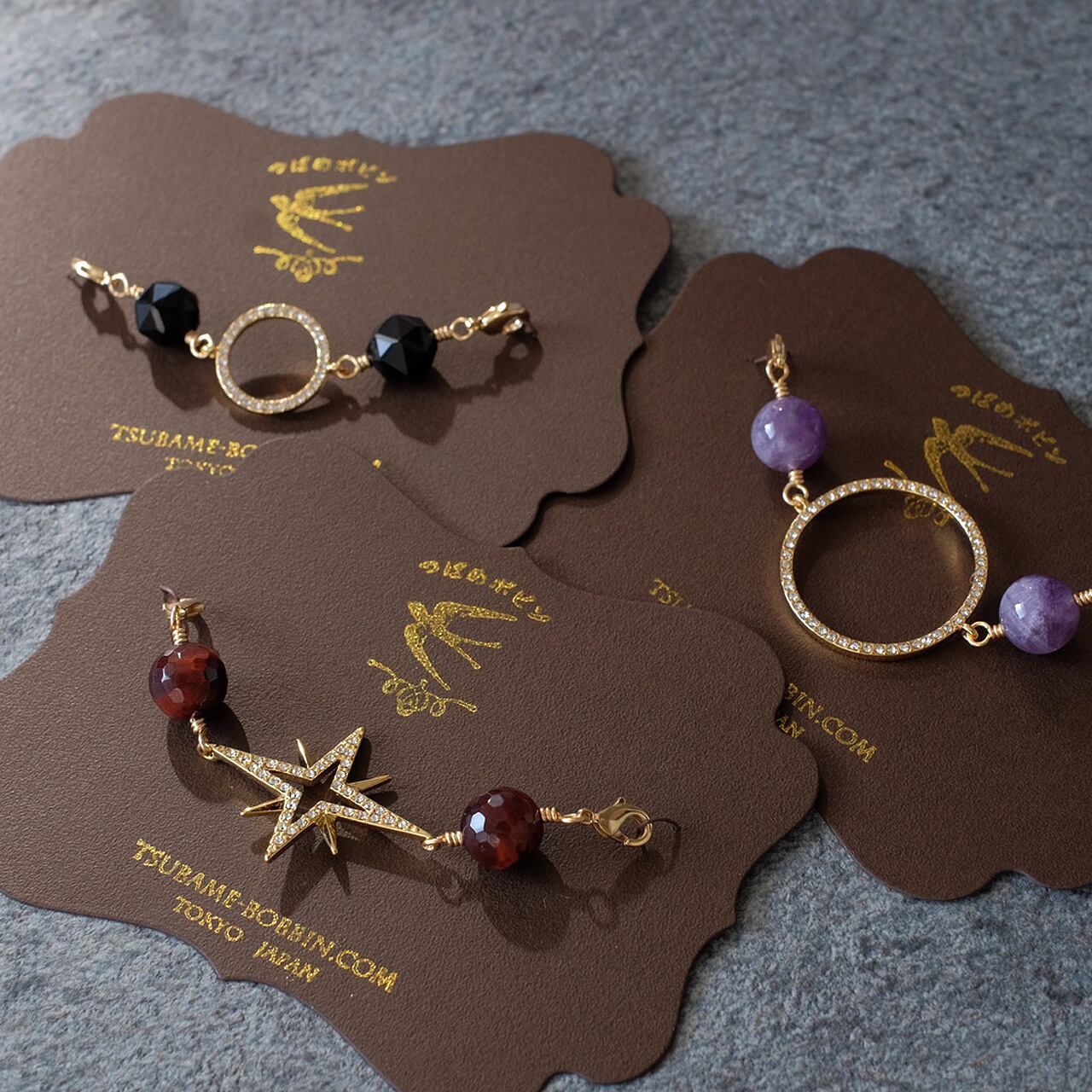キラリと輝くスターのチャーム(縦約2.3cm×横約3.4cm)の左右に天然石を合わせました。