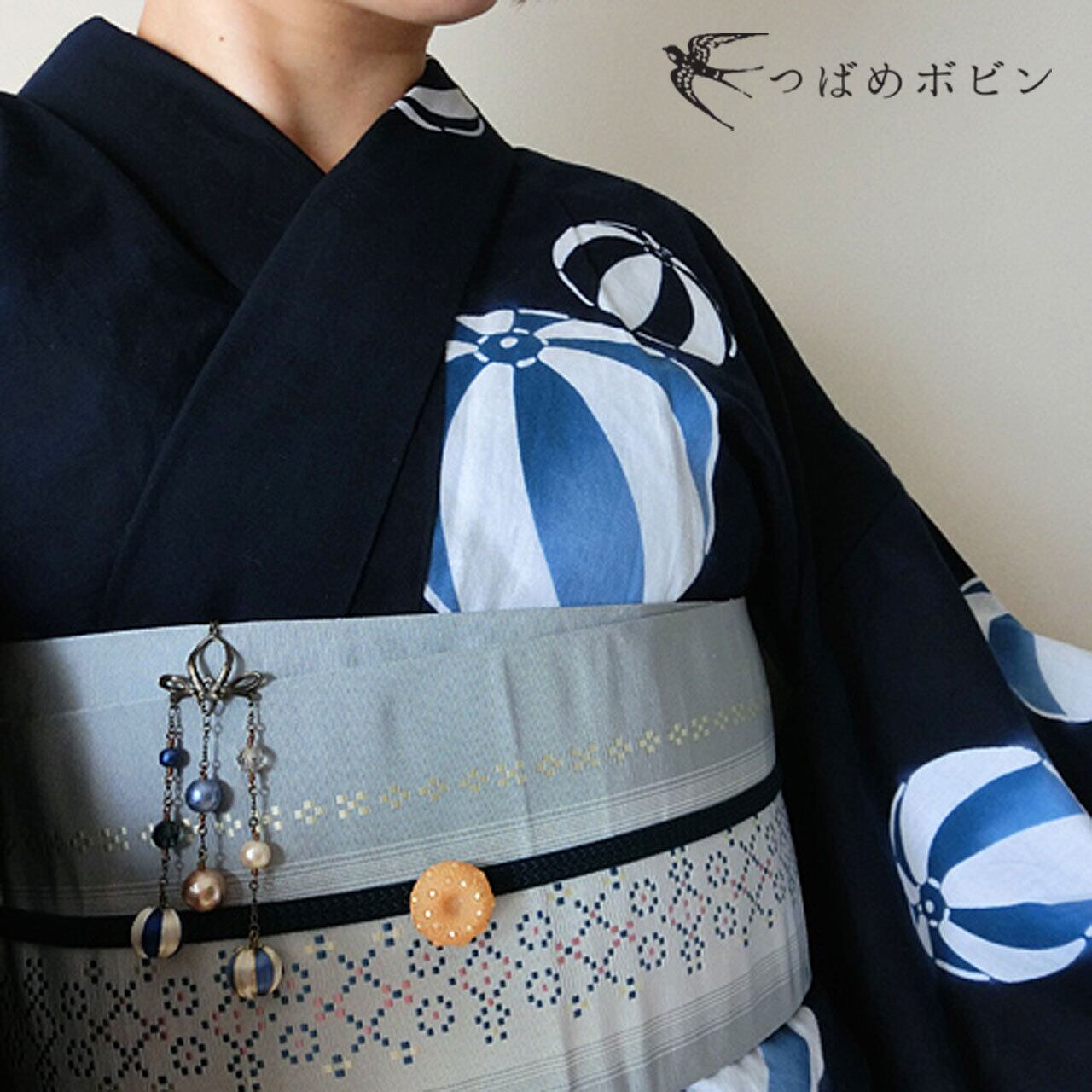 ピンの部分に帯締めや三分紐を通していただくと、キモノの帯留めとしてもお使いいただけます。