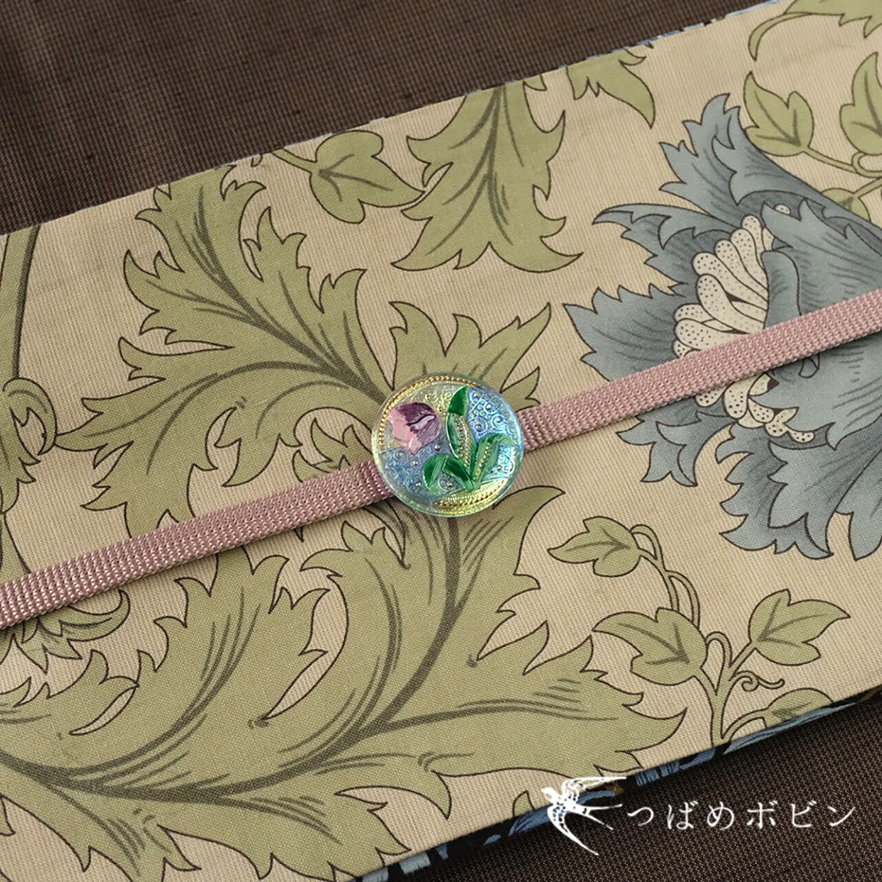 ガラスの製造では高度な技術をもつ、チェコ共和国で作られた装飾的なガラス製ボタンを帯留に仕立てました。