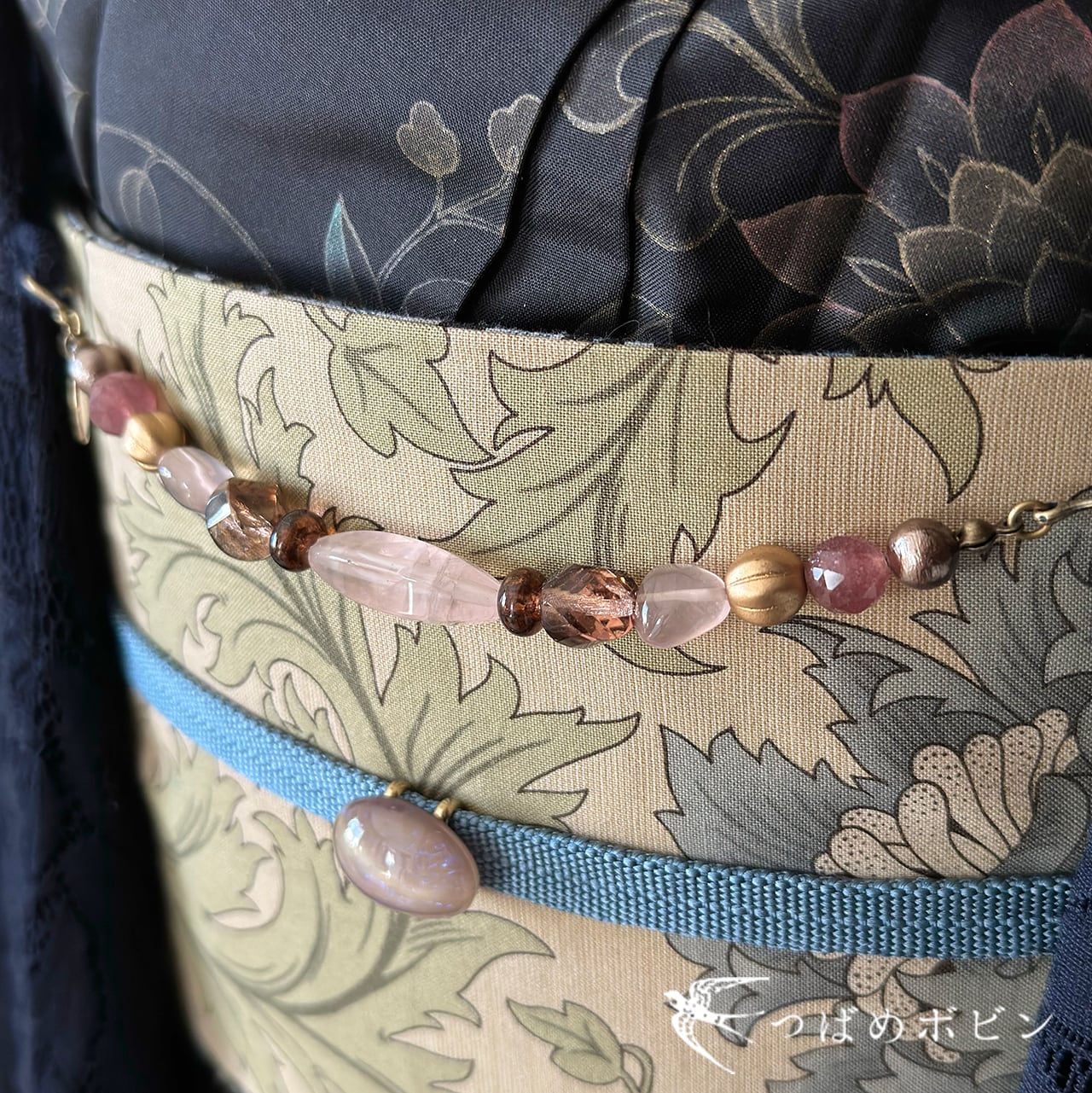 カジュアル着物にも合わせやすい落ち着いた中間色で、天然石の存在感が目を惹きます。