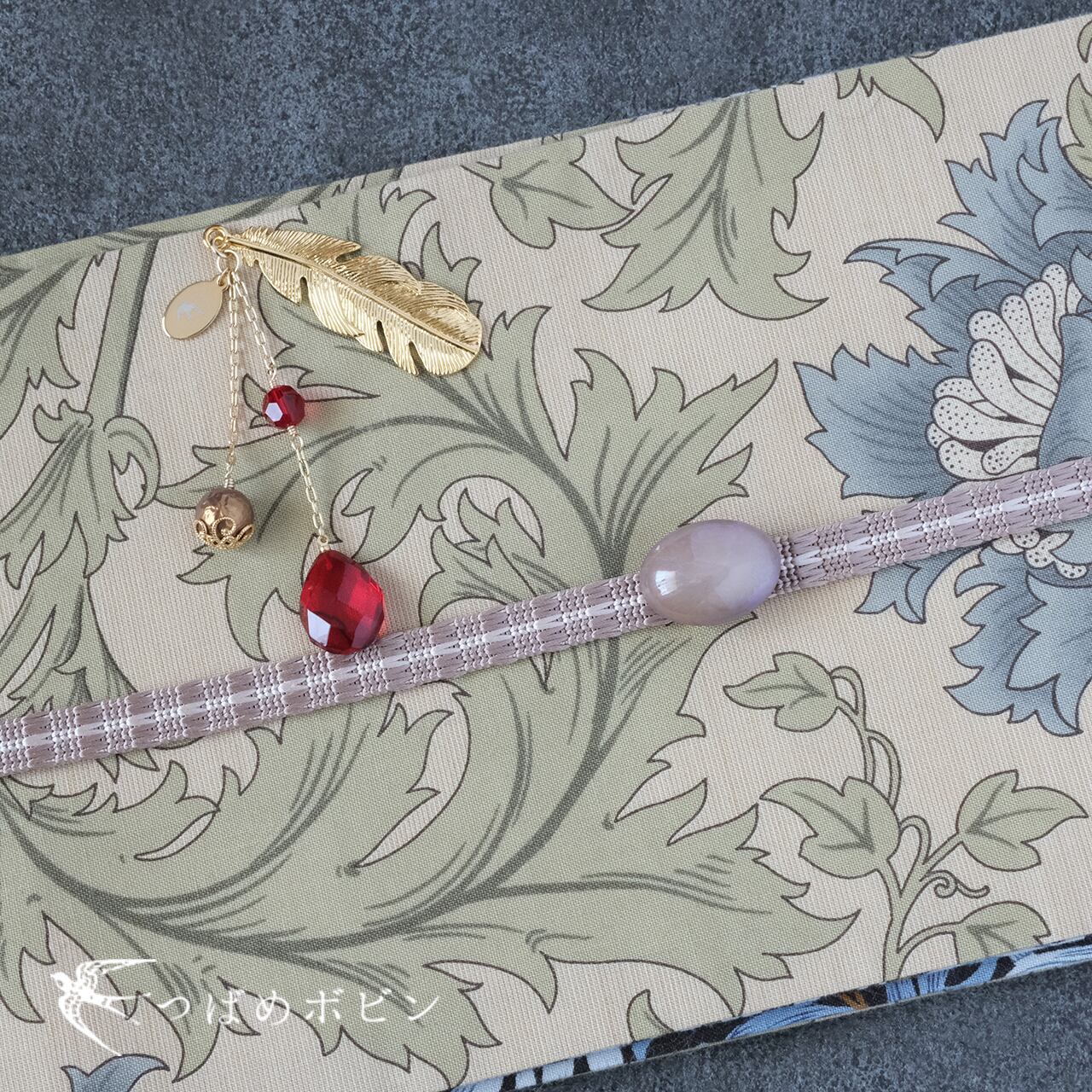 帯の中に入れる部分は、羽根をかたどったデザイン性のあるチャームを合わせました。