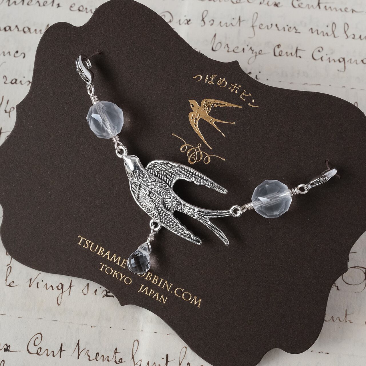 存在感のあるつばめのチャームの左右に天然石を、下にはしずく型の水晶を合わせました。