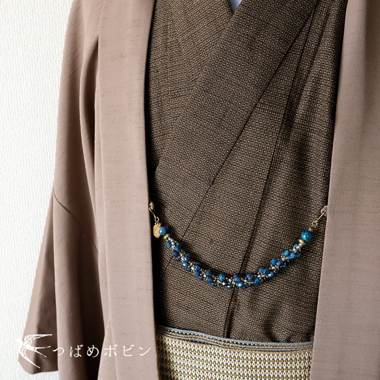 両端には天然石(アパタイト)をあしらい、羽織の「乳」に留める部分は着け外しのしやすいフック状の金具で仕上げました。