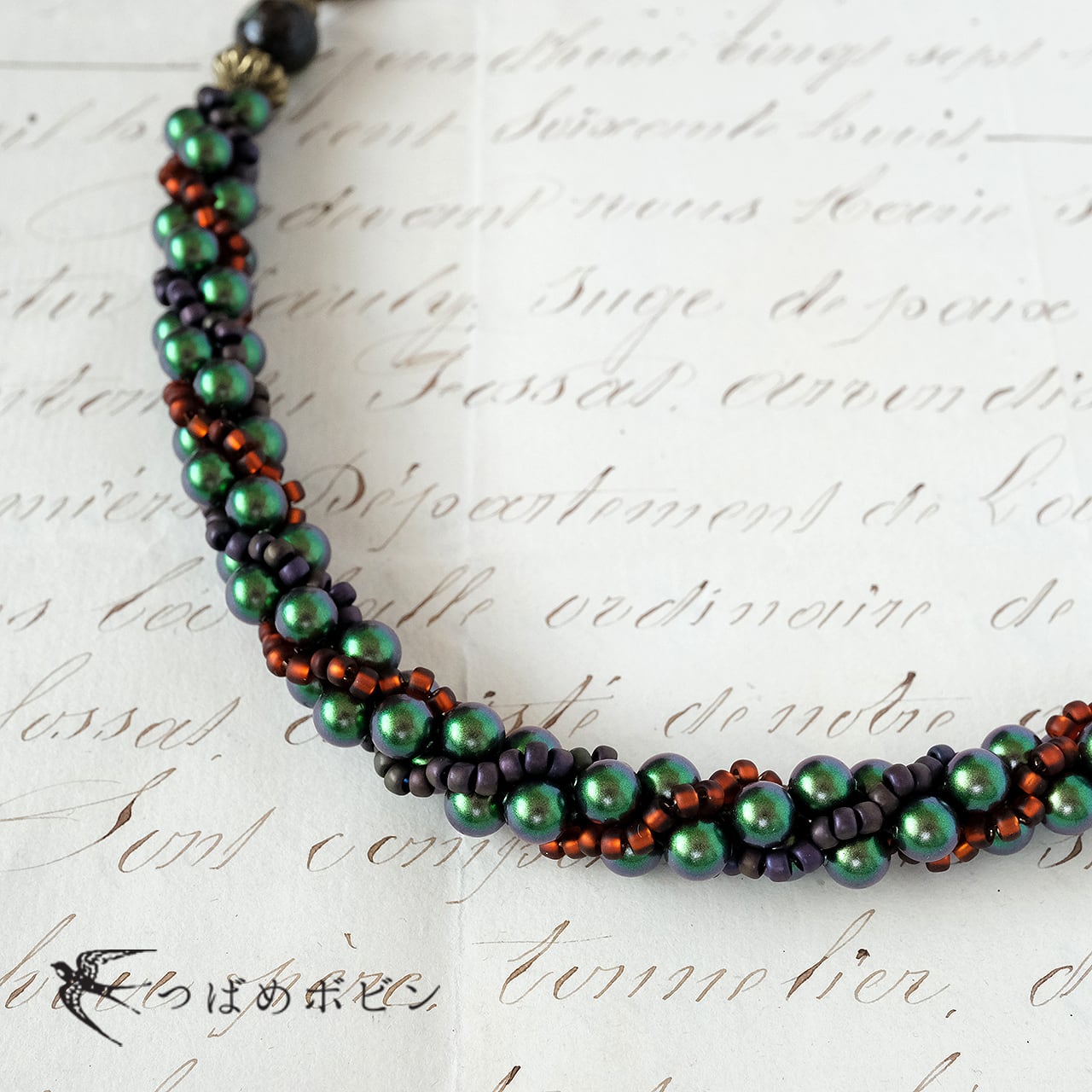 スワロフスキー社の独特なマットな輝きのあるガラスパールをメインに、艶消しのオレンジ、ブラウンのグラスビーズを合わせ、かぎ針で螺旋状に編んで制作しました。