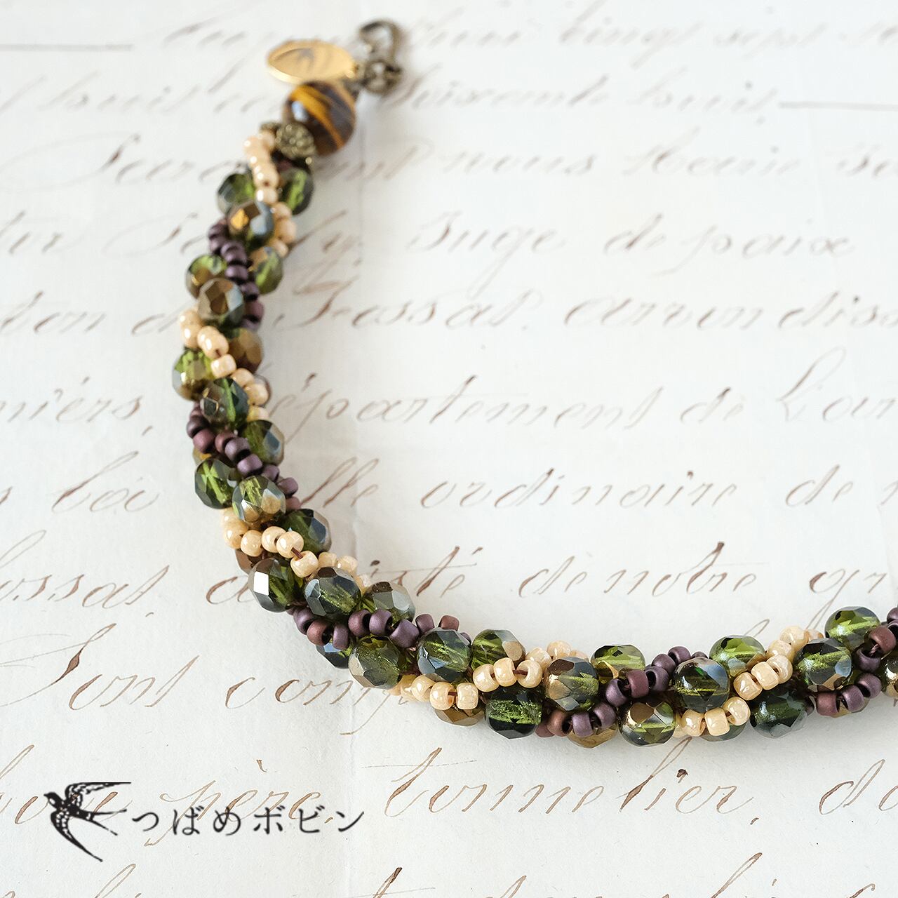 カットの施された、透明感のあるオリーブグリーンのガラスビーズをメインに、明るいベージュとマットブラウンのグラスビーズを合わせ、かぎ針で螺旋状に編んで制作しました。