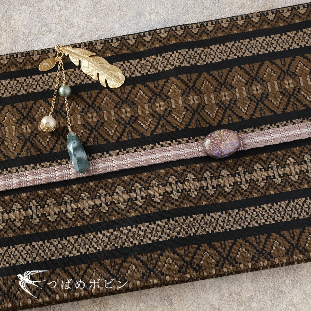 帯の中に入れる部分は、羽根をかたどったデザイン性のあるチャームを合わせました。