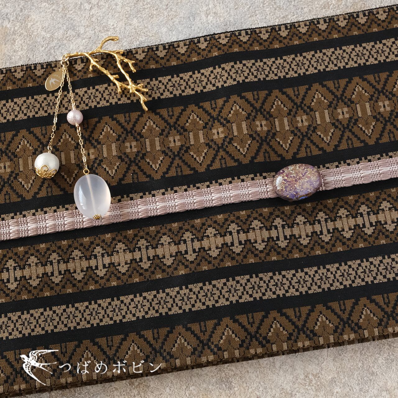 帯の中に入れる部分は、枝のようなデザイン性のあるチャームを合わせました。