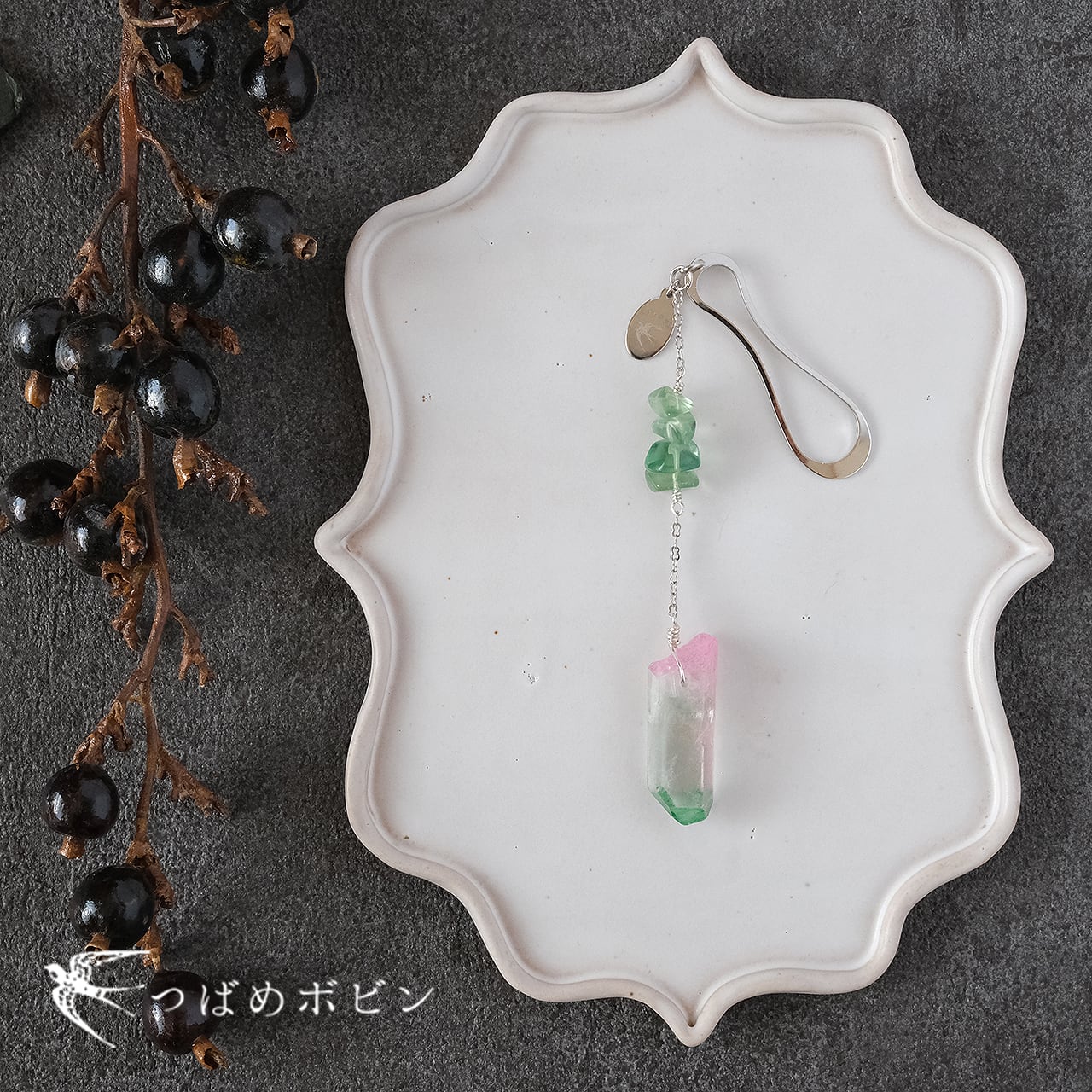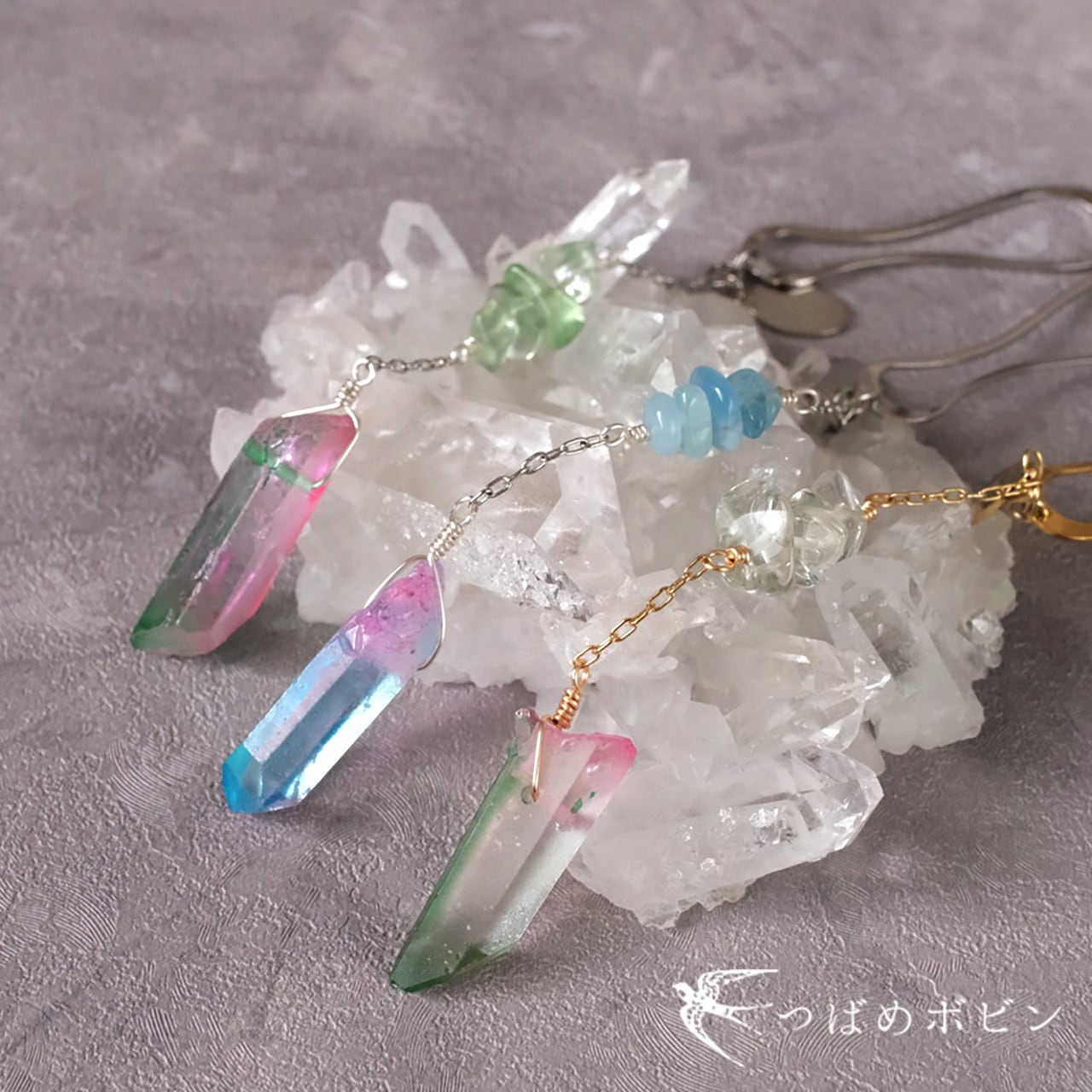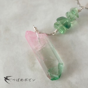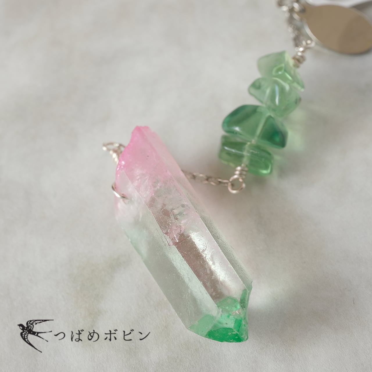 水晶の鉱物感に合わせて、細かなさざれ状の天然石(フローライト)をキュッとまとめて、チェーンで繋ぎました。