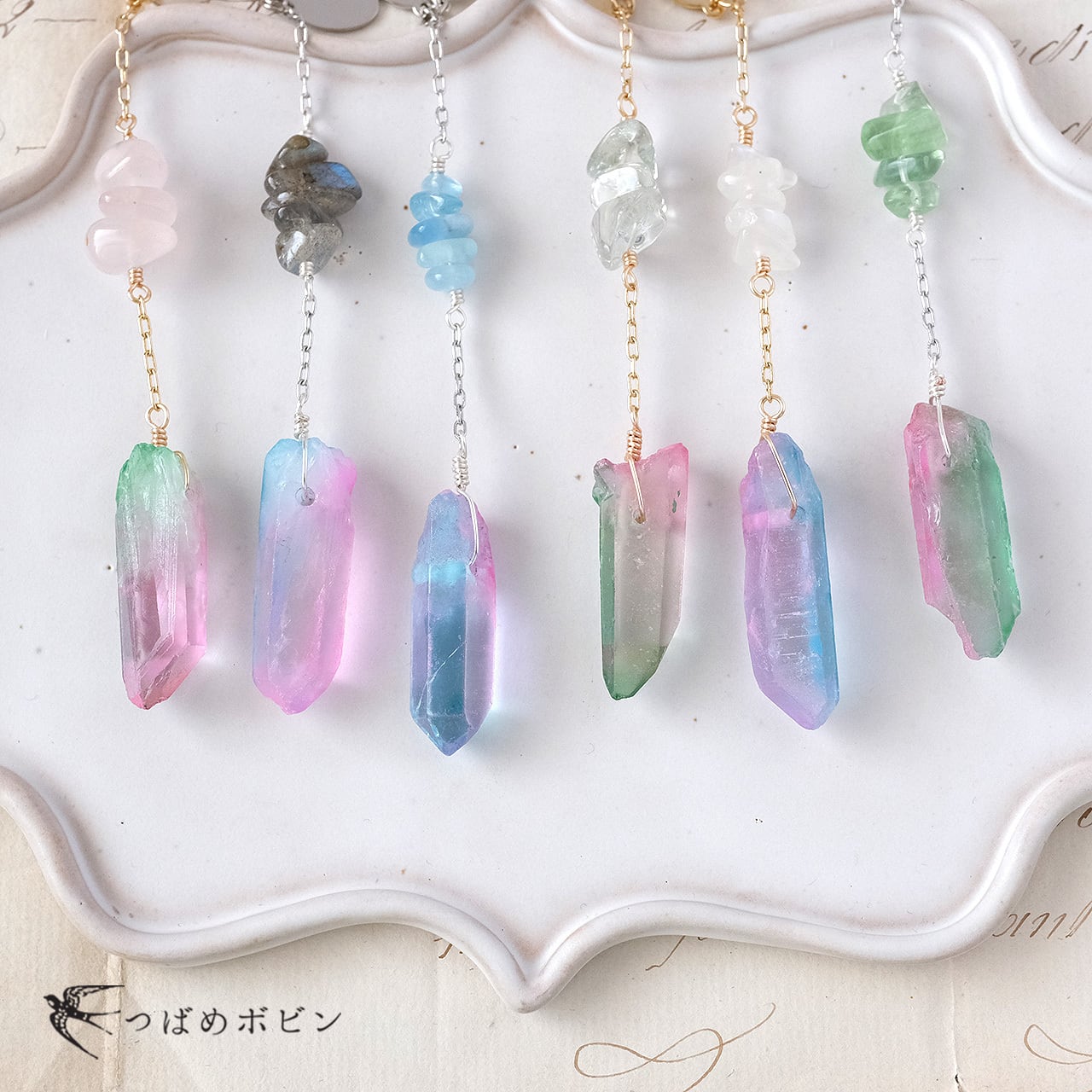 メインの水晶は磨いていない原石に色加工を施しているため、原石由来のキズやクラック、ゴツゴツとした不揃いな形や着色が均一でないなど、きれいでない部分もありますが、素材の特性としてご理解くださいませ。