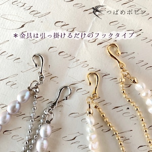 両端にはコットンパールをあしらい、羽織の「乳」に留める部分は着け外しのしやすいフック状の金具で仕上げました。