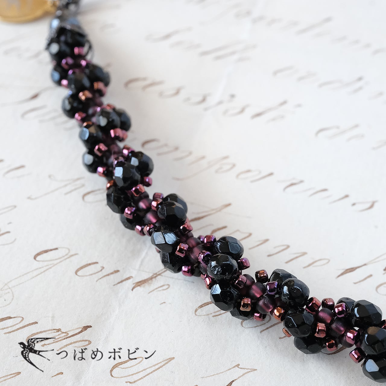 ブラックのチェコ製ガラスビーズをメインに、マットなパープル、落ち着いたワインレッドのグラスビーズをスパイラル状に、ひと粒ずつ丁寧に刺して製作しています。