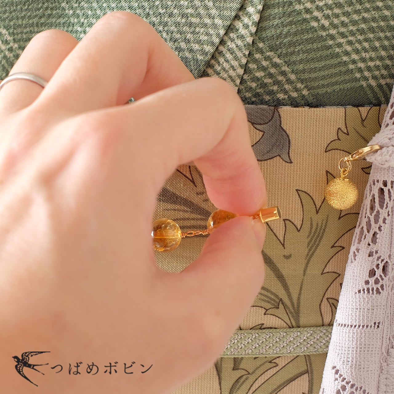 一般的に、マグネット付き羽織紐のマグネットは真ん中にあることが多いですが、つばめボビンのマグネット羽織紐は、あえてマグネットを端に配することで、淡水パールの美しい連なりを邪魔することなく着脱しやすくしています。